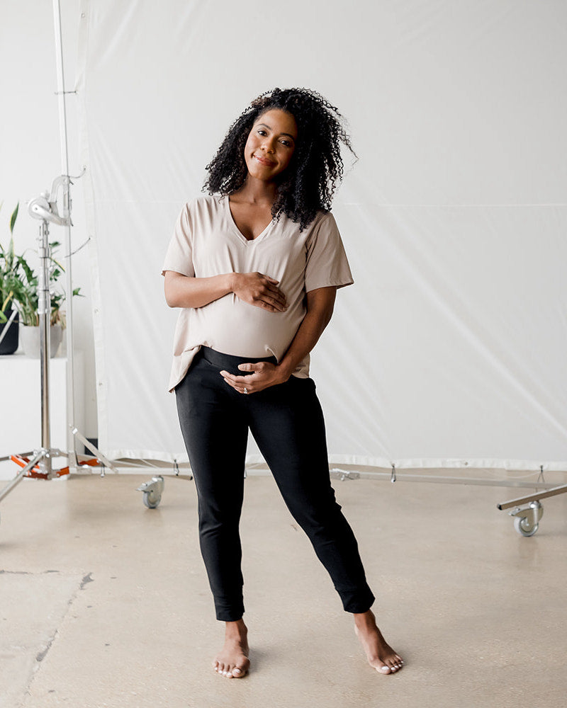 These dressy joggers will be your go-to pants for all stages of motherhood from your first trimester to your fourth trimester, and beyond. Sits below your bump when expecting, mid-rise beyond the bump. Super soft, stretchy and stylish joggers for maternity, postpartum, and beyond. Perfect for all-day wear, from lounging at home to work.