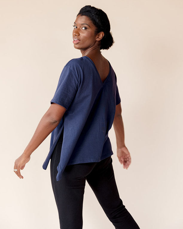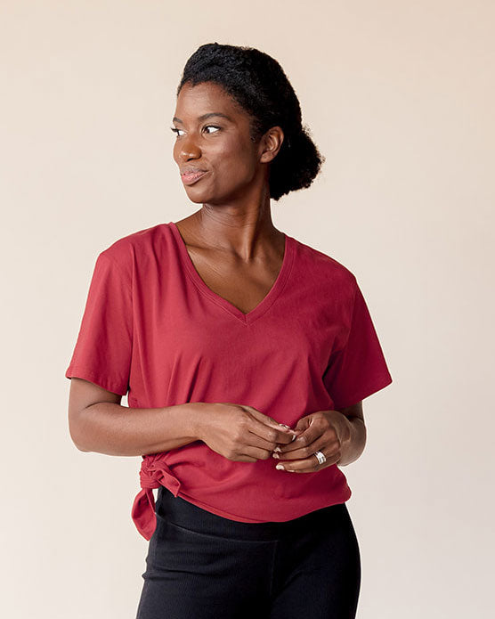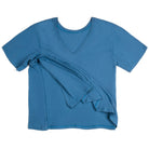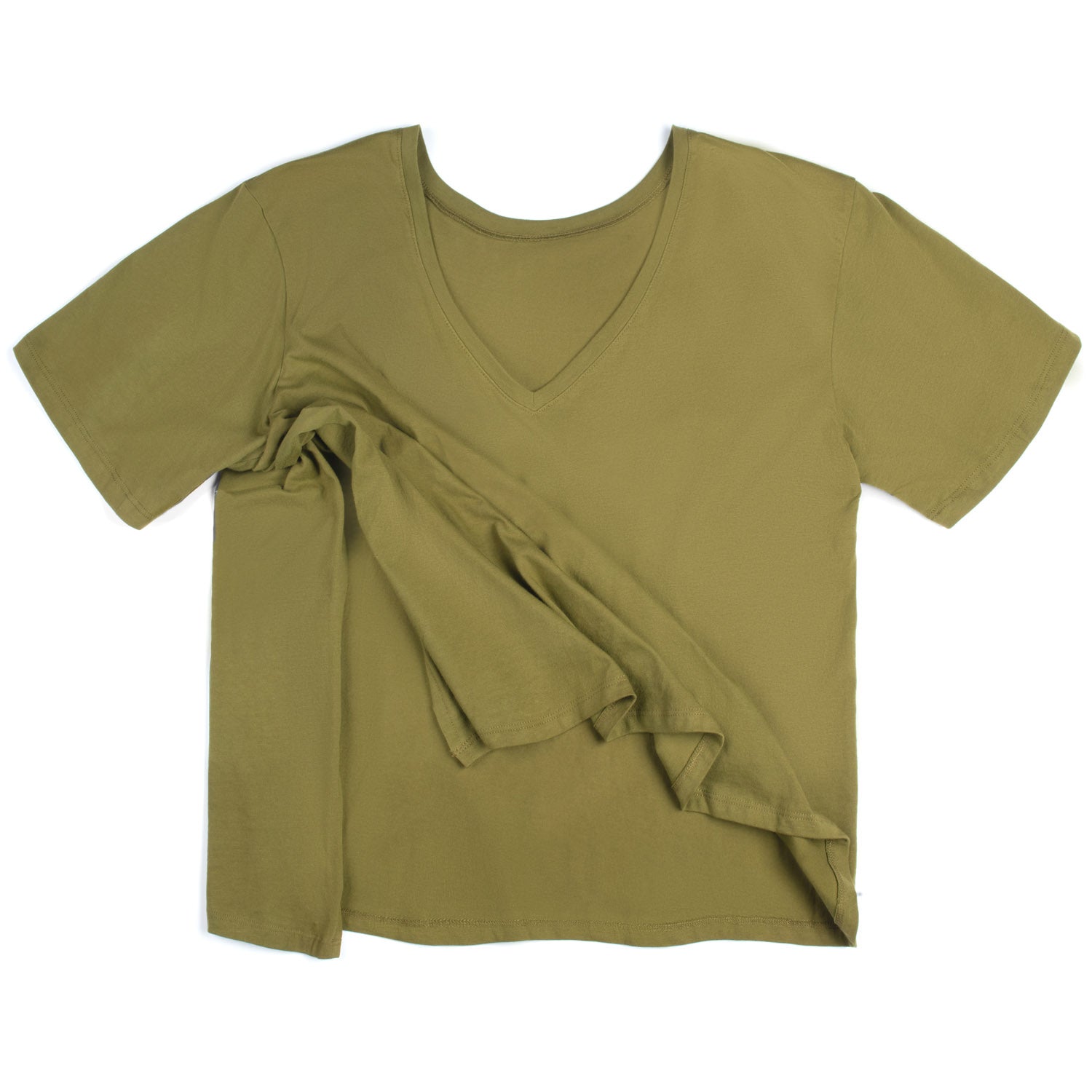 The nursing v-neck tee offers easy pull-down access for nursing and features a convenient side slit for pumping or additional nursing access.