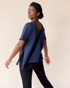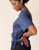 With six different ways to wear it, this maternity shirt allows you to experiment with your style effortlessly. Its V-neck front and side slit can be reversed to a crew neck, offering versatility and accommodating your changing preferences. The tie side not only adds a trendy touch but also allows you to personalize your look according to your style.